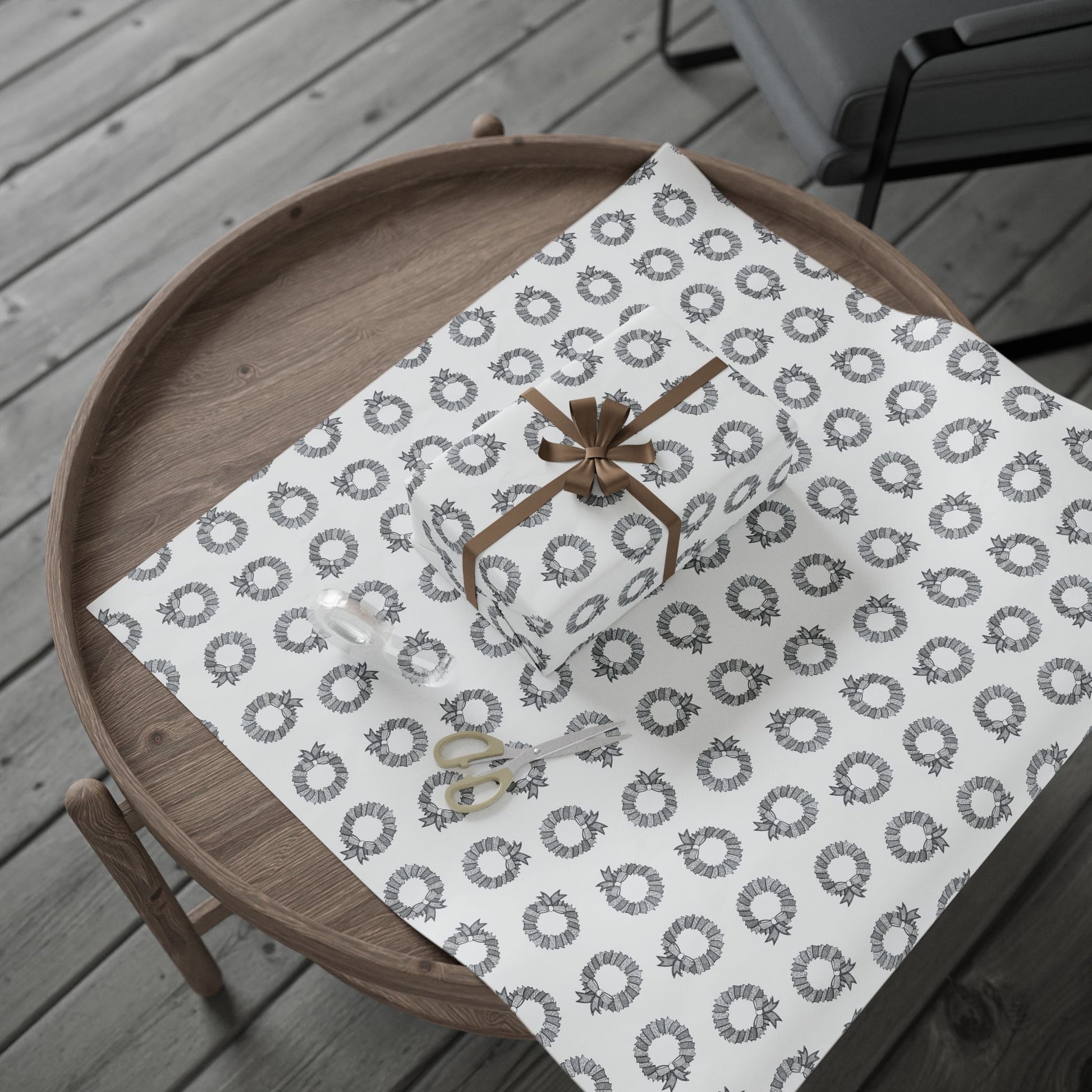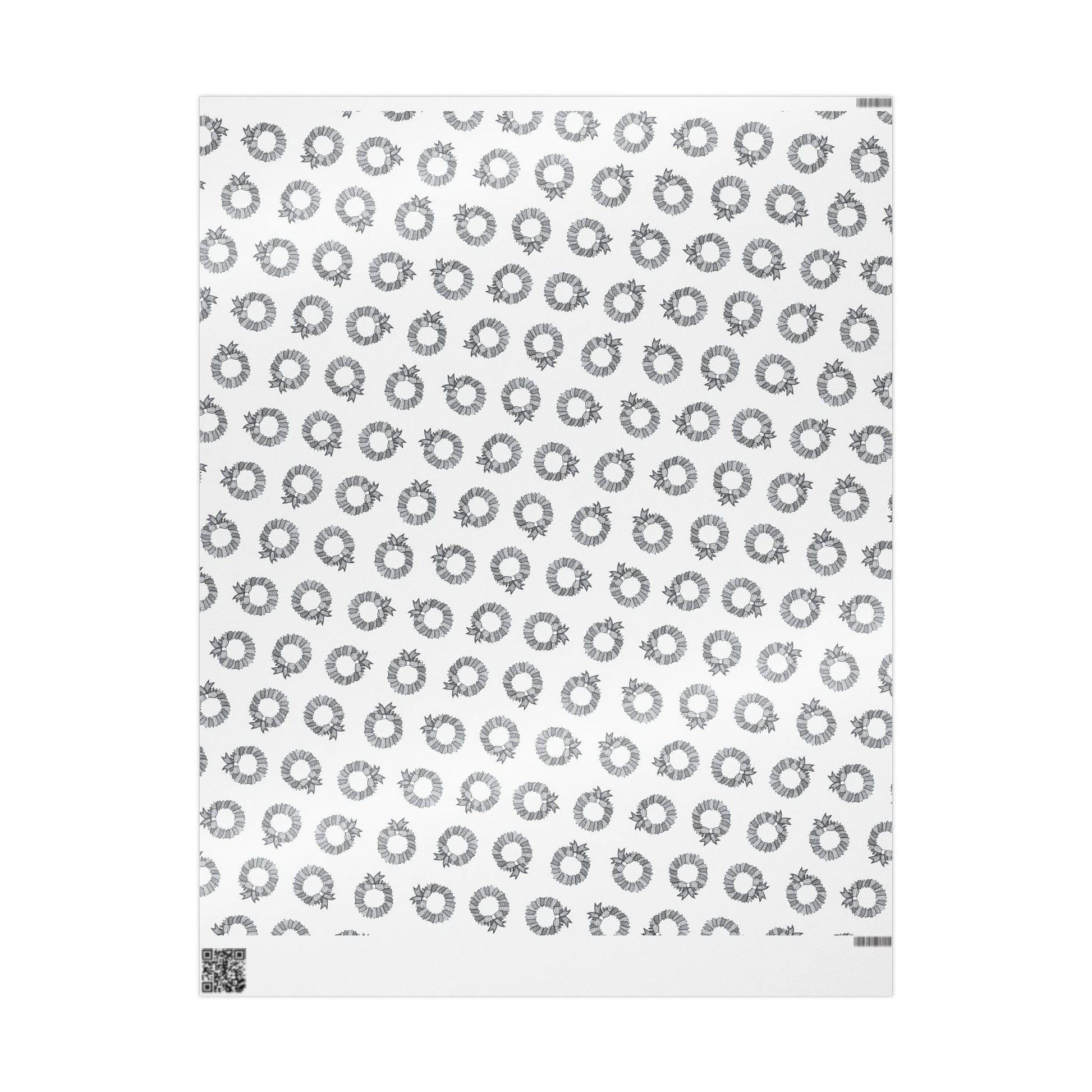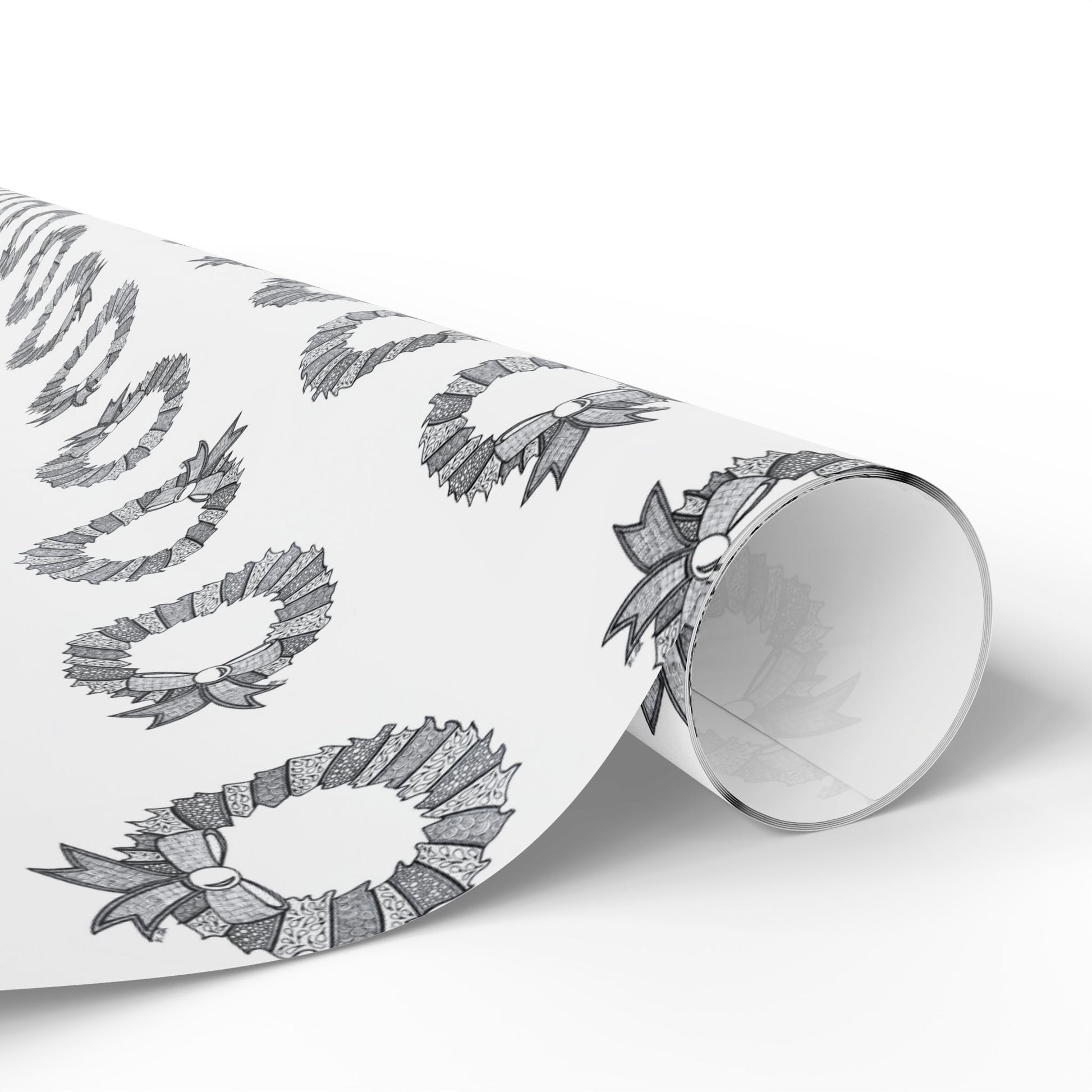 Hand-illustrated wreaths dance across crisp white paper in a calm, monochrome palette. This wrapping paper brings a quiet, artful touch to gift-giving—subtle holiday energy without loud colors. Smooth lines and a delicate repeat pattern make it easy to wrap small boxes or long parcels. The design reads as intentionally understated: it complements craft-style ribbon, natural twine, and kraft accents, and slips easily into a minimalist or Scandinavian-inspired table of gifts. Each sheet feels tactile and substantial, keeping the focus on the moment of giving rather than the wrapping itself.